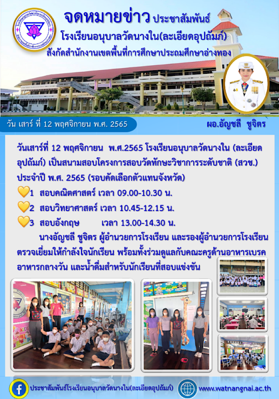 วันเสาร์ที่ 12 พฤศจิกายน พ.ศ.2565 โรงเรียนอนุบาลวัดนางใน (ละเอียดอุปถัมภ์) เป็นสนามสอบโครงการสอบวัดทักษะวิชาการระดับชาติ (สวช.) ประจำปี พ.ศ. 2565 (รอบคัดเลือกตัวแทนจังหวัด)