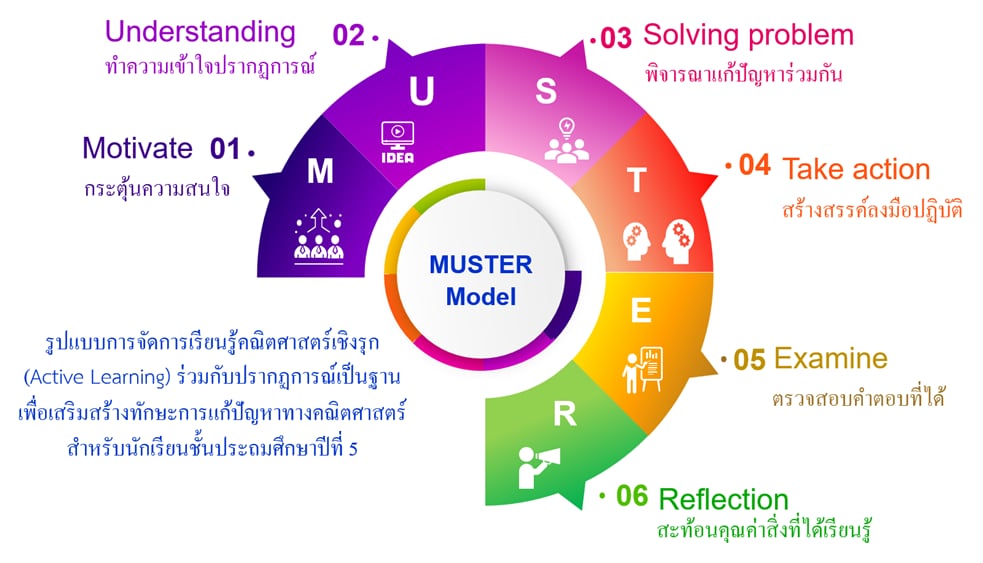 ชื่อผลงาน : นวัตกรรมการศึกษา เรื่อง การพัฒนารูปแบบการจัดการเรียนรู้คณิตศาสตร์เชิงรุก (Active Learning) ร่วมกับปรากฏการณ์เป็นฐาน เพื่อเสริมสร้างทักษะการแก้ปัญหาทางคณิตศาสตร์ สำหรับนักเรียนชั้น ประถมศึกษาปีที่ 5 (MUSTER Model)